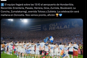 皇家社会官方社媒公布了夺冠庆祝游行安排:“球队将于13:10左右(北京时间19:10)抵达洪达里维亚机场。冠军巡游路线为伦特里亚、帕萨亚、埃雷拉、格罗斯、苏里奥拉、林荫大道、贝壳海滩、苏马拉卡雷吉、托洛萨大道和祖比埃塔。