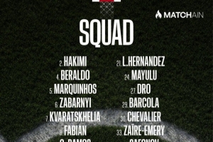 后卫:2-阿什拉夫、4-贝拉尔多、5-马尔基尼奥斯、6-扎巴尔尼、21-卢卡斯·埃尔南德斯、51-帕乔